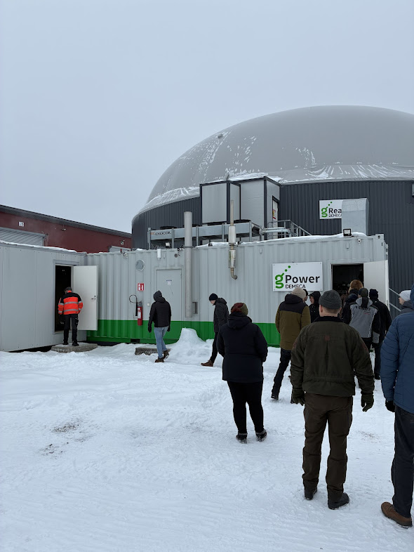 Päivä jatkui Ylivieskaan, jossa tutustuttiin maatilayhteyteen rakennettuun biokaasulaitokseen. Laitos hyödyntää erityisesti karjatalouden sivuvirtoja ja tuottaa biometaania liikennekäyttöön. Osa kaasusta myydään myös eteenpäin, mikä osoittaa biokaasutuotannon liiketoiminnallisia mahdollisuuksia.